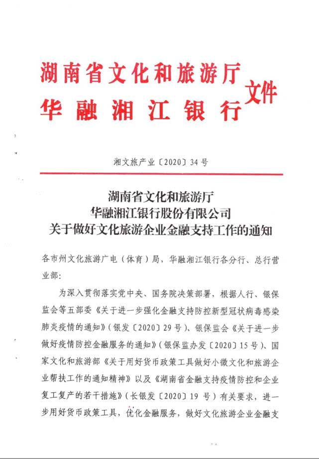 近日,湖南省文化和旅游厅与华融湘江银行联合下发《关于用好货币政策工具做好文化旅游企业金融支持工作的通知》(以下简称《通知》),从坚持政策导向、提供专属信贷产品、制定延期展期措施、畅通绿色通道、实行费率优惠、丰富融资方式等方面精准施策,加大对文化旅游企业的金融支持力度。
