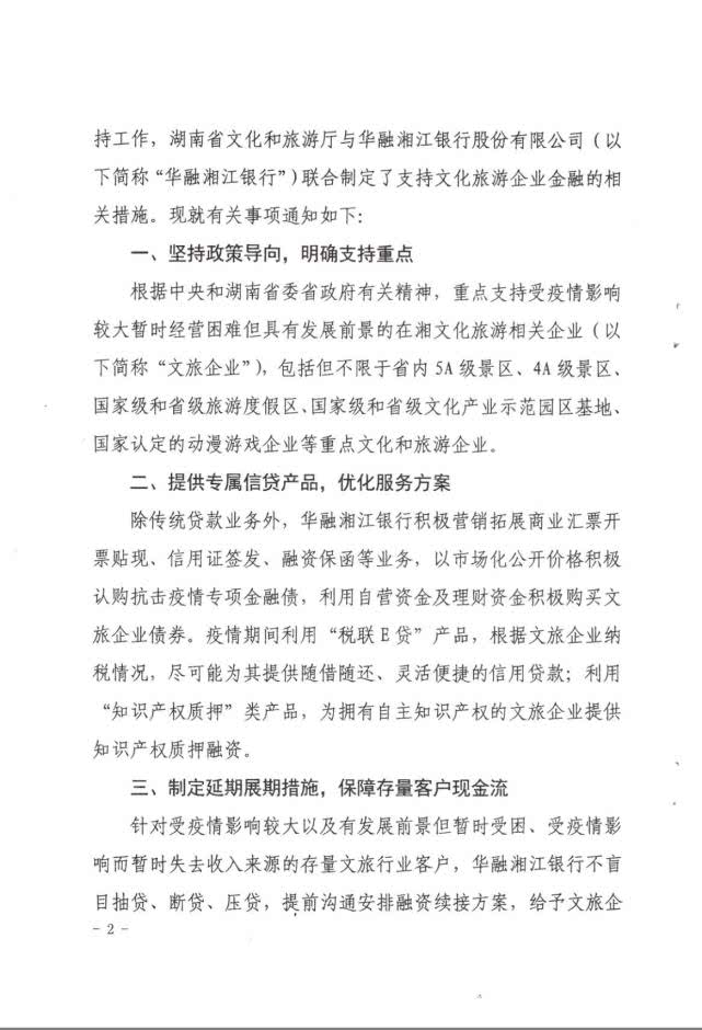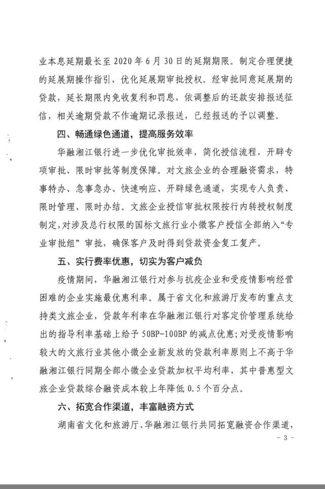 对文旅企业的融资需求,华融湘江银行将畅通绿色通道,优化审批效率,简化授信流程,开辟专项审批、限时审批等制度保障,及时发放贷款助企业复工复产;同时,对参与抗疫和受疫情影响经营困难的文旅企业实施优惠利率。(后附文件)
